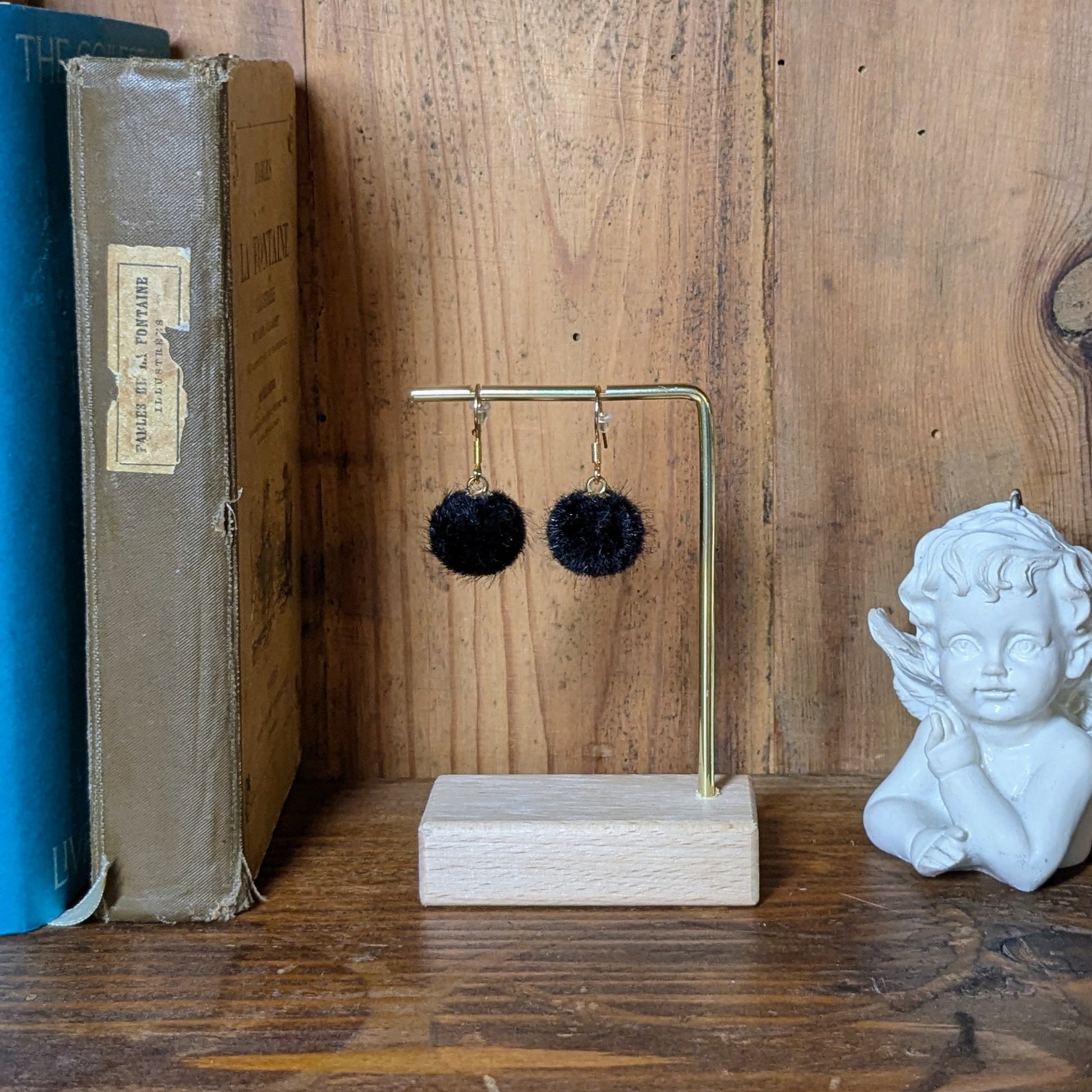 Matières: les crochets sont en acier inoxydable doré. Le pompon en acrylique.